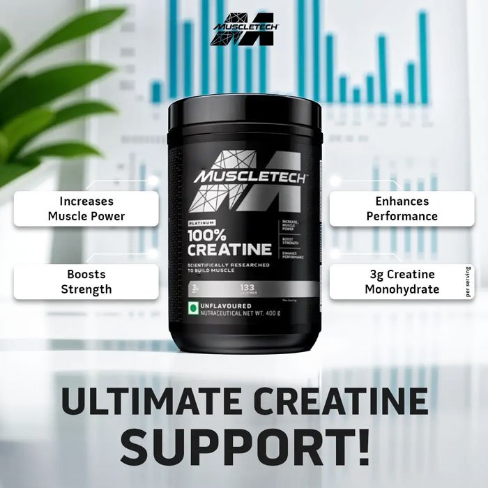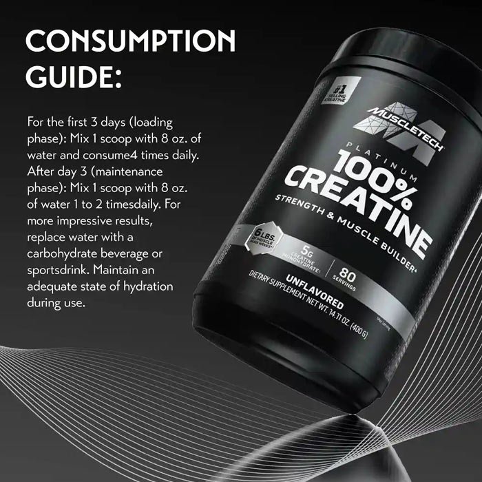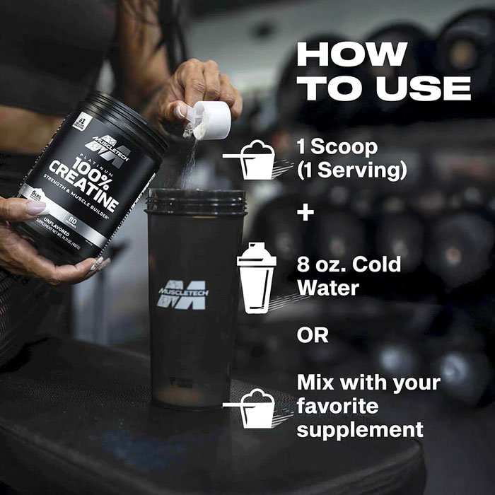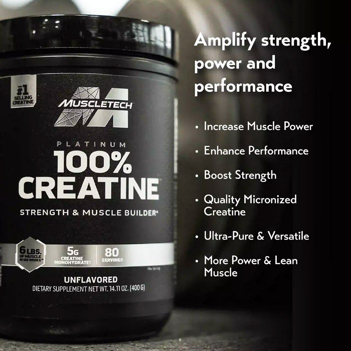 MuscleTech Platinum Creatine 100% is a high quality Creatine Monohydrate. Using a flavorless creatine allows all athletes to easily mix Creatine with other products and consume it at the same time in different Meals. Creatine monohydrate has favorable results for most athletes and is generally the most common type of Creatine used by Athletes.